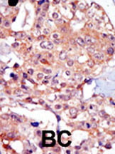 Formalin-fixed and paraffin-embedded human cancer tissue reacted with the primary antibody, which was peroxidase-conjugated to the secondary antibody, followed by DAB staining. This data demonstrates the use of this antibody for immunohistochemistry; clinical relevance has not been evaluated. BC = breast carcinoma; HC = hepatocarcinoma. |