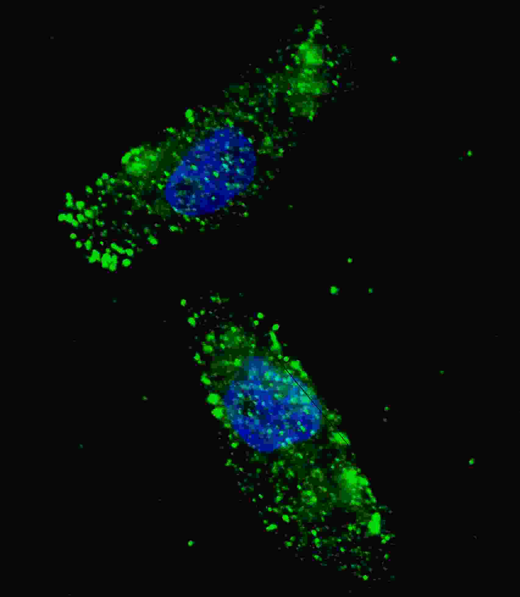 Fluorescent image of U251 cells stained with APG1 (ULK1) (Center) antibody. U251 cells were treated with Chloroquine (50 μM,16h), then fixed with 4% PFA (20 min), permeabilized with Triton X-100 (0.2%, 30 min). Cells were then incubated with APR07061G APG1 (ULK1) (Center) primary antibody (1:100, 2 h at room temperature). For secondary antibody, Alexa Fluor? 488 conjugated donkey anti-rabbit antibody (green) was used (1:1000, 1h). Nuclei were counterstained with Hoechst 33342 (blue) (10 μg/ml, 5 min). APG1 (ULK1) immunoreactivity is localized to autophagic vacuoles in the cytoplasm of U251 cells.