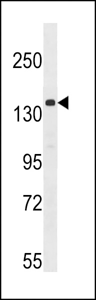 Western blot analysis of anti-ULK1 Pab (Cat. APR07061G) in A2058 cell lysate. ULK1 (arrow) was detected using purified Pab. Secondary HRP-anti-rabbit was used for signal visualization with chemiluminescence. |