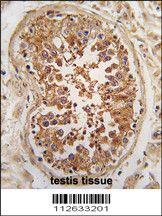 Formalin-fixed and paraffin-embedded human testis tissue reacted with *ULK3 antibody (N-term) (Cat. AMM08431G), which was peroxidase-conjugated to the secondary antibody, followed by DAB staining. This data demonstrates the use of this antibody for immunohistochemistry; clinical relevance has not been evaluated. |