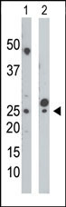 The anti-UCK Pab (Cat. APR07200G) is used in Western blot to detect UCK in mouse cerebellum tissue lysate (Lane 1) and HepG2 cell lysate (Lane 2).