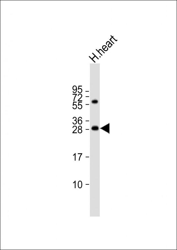 Anti-AK2 Antibody (C-term) at 1:2000 dilution + human heart lysate Lysates/proteins at 20 μg per lane. Secondary Goat Anti-Rabbit IgG, (H+L), Peroxidase conjugated at 1/10000 dilution. Predicted band size : 26 kDa Blocking/Dilution buffer: 5% NFDM/TBST.