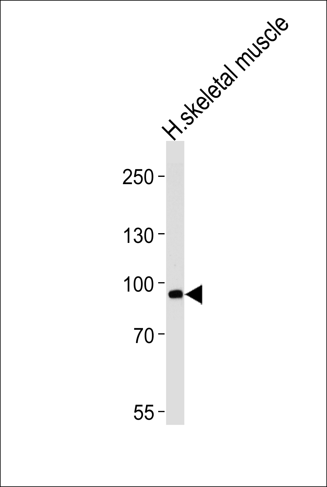 Western blot analysis of lysate from human skeletal muscle tissue lysate, using PFKM Antibody (S137)(Cat. AMM04616G). AMM04616G was diluted at 1:1000 at each lane. A goat anti-rabbit IgG H&L(HRP) at 1:5000 dilution was used as the secondary antibody. Lysate at 35ug per lane.