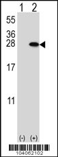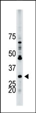 Western blot analysis of YWHAB (arrow) using rabbit polyclonal YWHAB Antibody (T71) (Cat. APG03025G). 293 cell lysates (2 ug/lane) either nontransfected (Lane 1) or transiently transfected (Lane 2) with the YWHAB gene. |