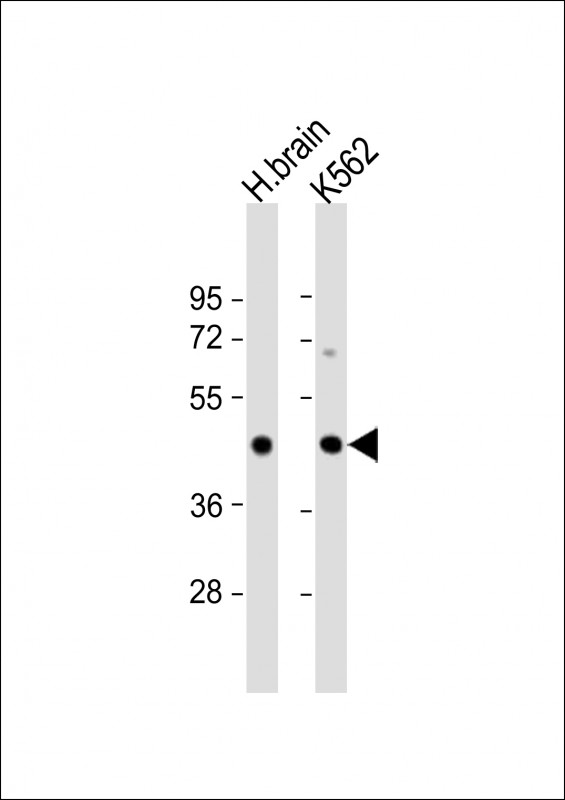 All lanes : Anti-ITPKA Antibody (C-term) at 1:1000 dilution Lane 1: human brain lysate Lane 2: K562 whole cell lysate Lysates/proteins at 20 μg per lane. Secondary Goat Anti-Rabbit IgG, (H+L), Peroxidase conjugated at 1/10000 dilution. Predicted band size : 51 kDa Blocking/Dilution buffer: 5% NFDM/TBST.
