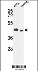 Western blot analysis of hITPKA-E360 (Cat. APR16947G) in K562 cell line and mouse lung tissue lysates (35ug/lane). ITPKA (arrow) was detected using the purified Pab. |