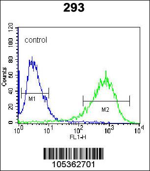 ITPKB Antibody (N-term) (Cat. APR16949G) flow cytometric analysis of 293 cells (right histogram) compared to a negative control cell (left histogram).FITC-conjugated goat-anti-rabbit secondary antibodies were used for the analysis. |