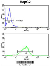 GPD1 Antibody (N-term) (Cat. AMM05180G) flow cytometry analysis of HepG2 cells (bottom histogram) compared to a negative control cell (top histogram). FITC-conjugated goat-anti-rabbit secondary antibodies were used for the analysis. |