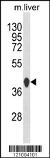 Western blot analysis of HPD Antibody (C-term) (Cat. AMM05345G) in mouse liver tissue lysates (35ug/lane). HPD (arrow) was detected using the purified Pab.