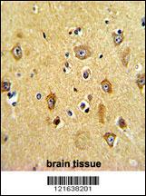 Formalin-fixed and paraffin-embedded human brain tissue with PPP2R2B Antibody (Center), which was peroxidase-conjugated to the secondary antibody, followed by DAB staining. This data demonstrates the use of this antibody for immunohistochemistry; clinical relevance has not been evaluated.