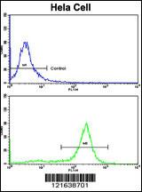 Flow cytometric analysis of hela cells using PPP2R2B Antibody (Center)(bottom histogram) compared to a negative control cell (top histogram). FITC-conjugated goat-anti-rabbit secondary antibodies were used for the analysis. |