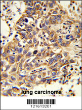 Formalin-fixed and paraffin-embedded human lung carcinoma reacted with CAT Antibody (Center), which was peroxidase-conjugated to the secondary antibody, followed by DAB staining. This data demonstrates the use of this antibody for immunohistochemistry; clinical relevance has not been evaluated.