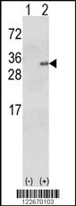 Western blot analysis of GSTA1 (arrow) using rabbit polyclonal GSTA1 Antibody (Cat. AMM05229G). 293 cell lysates (2 ug/lane) either nontransfected (Lane 1) or transiently transfected with the GSTA1 gene (Lane 2) . |