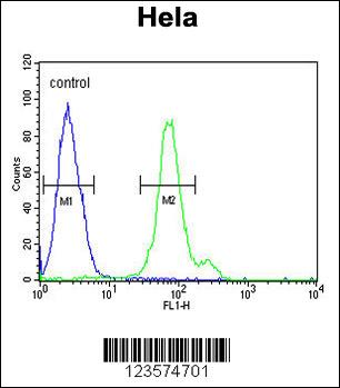 CTPS2 Antibody (N-term) (Cat. APG02830G) flow cytometric analysis of Hela cells (right histogram) compared to a negative control cell (left histogram).FITC-conjugated goat-anti-rabbit secondary antibodies were used for the analysis. |