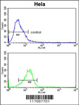 CYP7B1 Antibody (Center) (Cat. APR07468G) flow cytometric analysis of Hela cells (bottom histogram) compared to a negative control cell (top histogram).FITC-conjugated goat-anti-rabbit secondary antibodies were used for the analysis. |