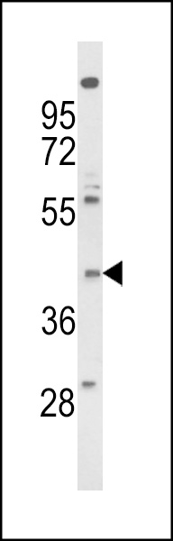 Western blot analysis of FPRL2 Antibody (Center) (Cat. APR16022G) in NCI-H460 cell line lysates (35ug/lane). FPRL2 (arrow) was detected using the purified Pab.