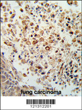 Formalin-fixed and paraffin-embedded human lung carcinoma reacted with FPRL2 Antibody (Center), which was peroxidase-conjugated to the secondary antibody, followed by DAB staining. This data demonstrates the use of this antibody for immunohistochemistry; clinical relevance has not been evaluated.