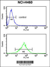 FPRL2 Antibody (Center) (Cat. APR16022G) flow cytometry analysis of NCI-H460 cells (bottom histogram) compared to a negative control cell (top histogram).FITC-conjugated goat-anti-rabbit secondary antibodies were used for the analysis. |