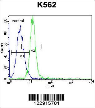 KCNH2 Antibody (Center) (Cat. AMM06113G) flow cytometric analysis of K562 cells (right histogram) compared to a negative control cell (left histogram).FITC-conjugated goat-anti-rabbit secondary antibodies were used for the analysis. |