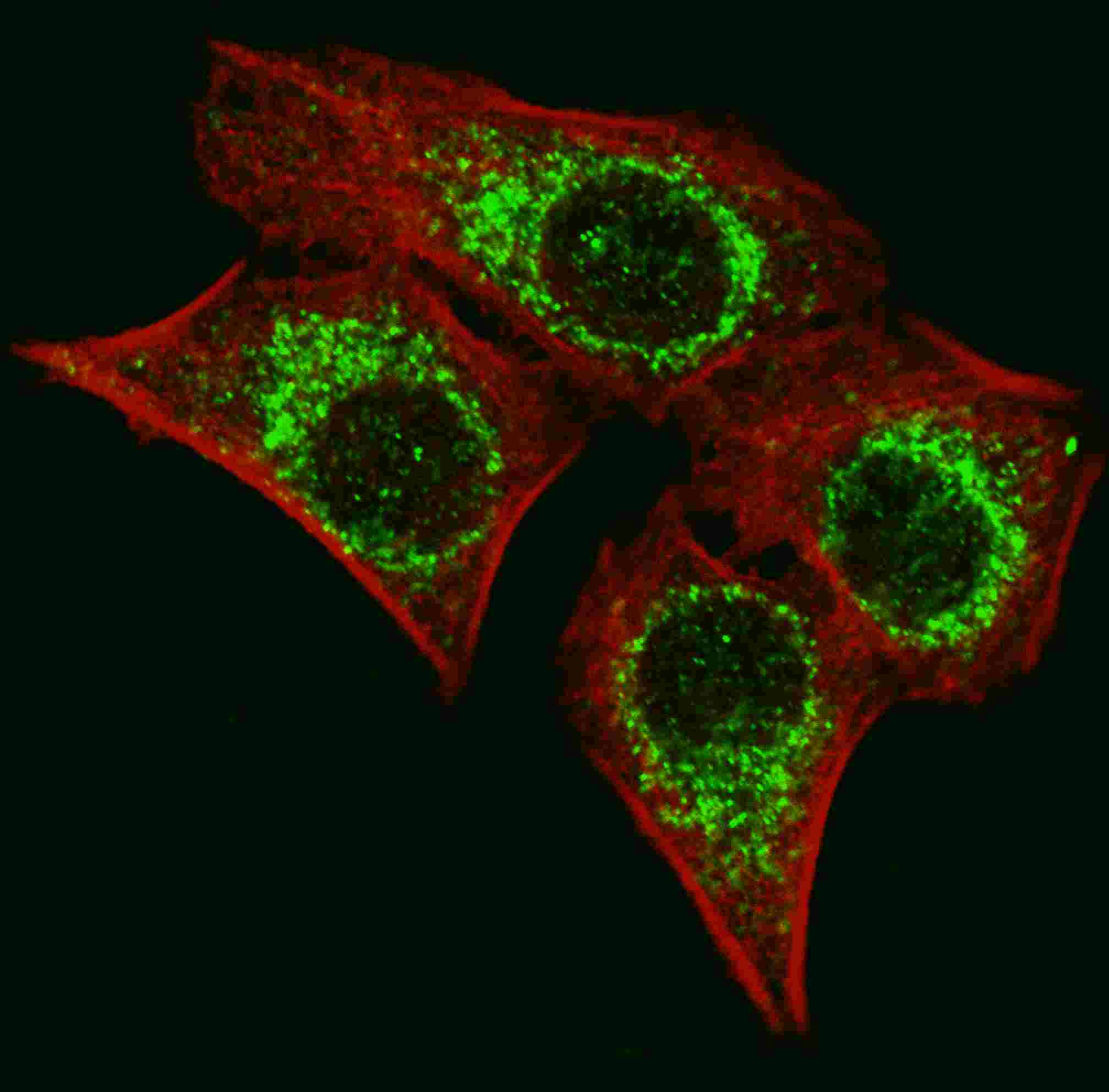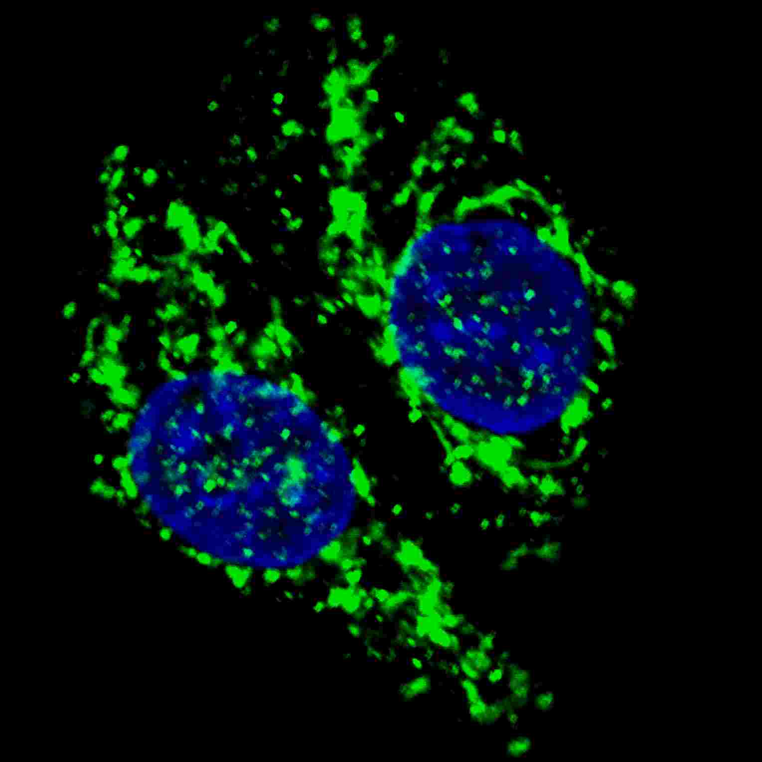 Fluorescent confocal image of U251 cells stained with AIFM1 (N-term) antibody. U251 cells were treated with Chloroquine (50 μM,16h), then fixed with 4% PFA (20 min), permeabilized with Triton X-100 (0.2%, 30 min). Cells were then incubated with APG01634G AIFM1 (N-term) primary antibody (1:200, 2 h at room temperature). For secondary antibody, Alexa Fluor? 488 conjugated donkey anti-rabbit antibody (green) was used (1:1000, 1h). Nuclei were counterstained with Hoechst 33342 (blue) (10 μg/ml, 5 min). AIFM1 (N-term) immunoreactivity is localized to the cytoplasm of U251 cells.