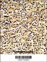 Formalin-fixed and paraffin-embedded human lymph tissue reacted with DTX1 Antibody (Center), which was peroxidase-conjugated to the secondary antibody, followed by DAB staining. This data demonstrates the use of this antibody for immunohistochemistry; clinical relevance has not been evaluated.