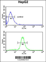 GSTA4 Antibody (N-term) (Cat. AMM05236G) flow cytometric analysis of HepG2 cells (bottom histogram) compared to a negative control cell (top histogram).FITC-conjugated goat-anti-rabbit secondary antibodies were used for the analysis. |