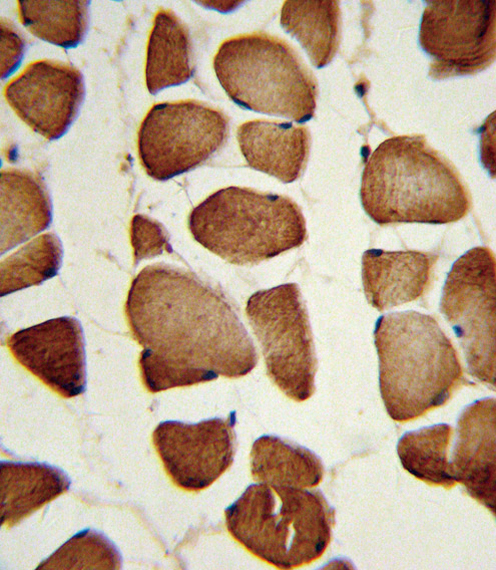 Formalin-fixed and paraffin-embedded human skeletal muscle reacted with NAMPT Antibody (Center), which was peroxidase-conjugated to the secondary antibody, followed by DAB staining. This data demonstrates the use of this antibody for immunohistochemistry; clinical relevance has not been evaluated. |
