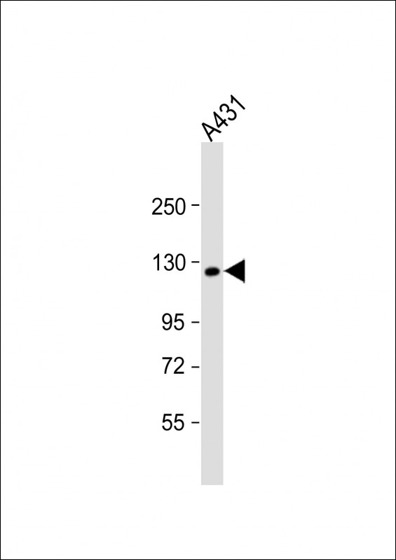 Anti-KIF11 Antibody (N-term) at 1:1000 dilution + A431 whole cell lysate Lysates/proteins at 20 μg per lane. Secondary Goat Anti-Rabbit IgG, (H+L), Peroxidase conjugated at 1/10000 dilution. Predicted band size : 119 kDa Blocking/Dilution buffer: 5% NFDM/TBST.