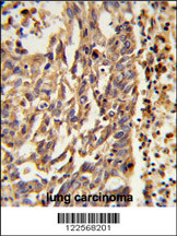 Formalin-fixed and paraffin-embedded human lung carcinoma reacted with KIF11 Antibody (N-term), which was peroxidase-conjugated to the secondary antibody, followed by DAB staining. This data demonstrates the use of this antibody for immunohistochemistry; clinical relevance has not been evaluated. |
