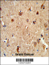 Formalin-fixed and paraffin-embedded human brain tissue reacted with CES7 Antibody (Center), which was peroxidase-conjugated to the secondary antibody, followed by DAB staining. This data demonstrates the use of this antibody for immunohistochemistry; clinical relevance has not been evaluated. |