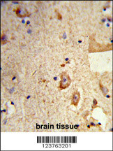 Formalin-fixed and paraffin-embedded human brain tissue reacted with DSTN Antibody (Center), which was peroxidase-conjugated to the secondary antibody, followed by DAB staining. This data demonstrates the use of this antibody for immunohistochemistry; clinical relevance has not been evaluated.
