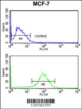 DSTN Antibody (Center) (Cat. AMM06963G) flow cytometry analysis of MCF-7 cells (bottom histogram) compared to a negative control cell (top histogram).FITC-conjugated goat-anti-rabbit secondary antibodies were used for the analysis. |