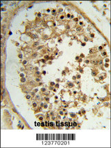 Formalin-fixed and paraffin-embedded human testis tissue reacted with ELOVL2 Antibody (N-term), which was peroxidase-conjugated to the secondary antibody, followed by DAB staining. This data demonstrates the use of this antibody for immunohistochemistry; clinical relevance has not been evaluated.