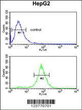 ELOVL2 Antibody (N-term) (Cat. APR07675G) flow cytometric analysis of HepG2 cells (bottom histogram) compared to a negative control cell (top histogram).FITC-conjugated goat-anti-rabbit secondary antibodies were used for the analysis. |
