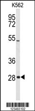 Western blot analysis of CLDN18 Antibody (C-term) (Cat. APR15477G) in K562 cell line lysates (35ug/lane). CLDN18 (arrow) was detected using the purified Pab.