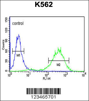 CLDN18 Antibody (C-term) (Cat. APR15477G) flow cytometric analysis of K562 cells (right histogram) compared to a negative control cell (left histogram).FITC-conjugated goat-anti-rabbit secondary antibodies were used for the analysis. |