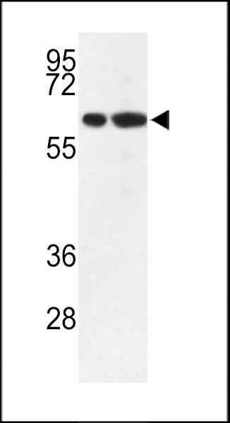 Western blot analysis of MOUSE VGLU2 Andibody (C-term) (Cat. AMM06469G) in mouse cerebellum, brain tissue lysates (35ug/lane). VGLU2 (arrow) was detected using the purified Pab. |