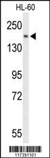 Western blot analysis of PLCB1 Antibody (C-term) (Cat. AMR09343G) in HL-60 cell line lysates (35ug/lane). PLCB1 (arrow) was detected using the purified Pab.