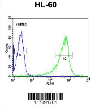 PLCB1 Antibody (C-term) (Cat. AMR09343G) flow cytometric analysis of HL-60 cells (right histogram) compared to a negative control cell (left histogram).FITC-conjugated goat-anti-rabbit secondary antibodies were used for the analysis. |