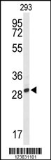 Western blot analysis of PNPO Antibody (C-term) (Cat. AMR09415G) in 293 cell line lysates (35ug/lane). PNPO (arrow) was detected using the purified Pab. |
