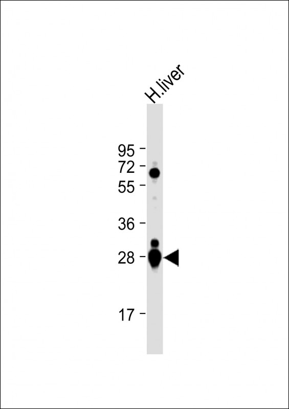 Anti-GSTA2 Antibody (N-term) at 1:1000 dilution + human liver lysate Lysates/proteins at 20 μg per lane. Secondary Goat Anti-Rabbit IgG, (H+L), Peroxidase conjugated at 1/10000 dilution. Predicted band size : 26 kDa Blocking/Dilution buffer: 5% NFDM/TBST.