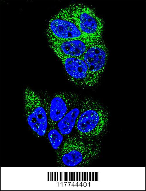 Confocal immunofluorescent analysis of HNF4A Antibody (N-term)( APR07788G) with MCF-7 cell followed by Alexa Fluor 488-conjugated goat anti-rabbit lgG (green). DAPI was used to stain the cell nuclear (blue). |