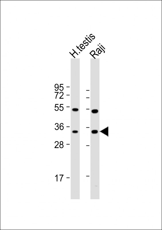 All lanes : Anti-HSD17B3 Antibody (Center) at 1:1000 dilution Lane 1: human testis lysate Lane 2: Raji whole cell lysate Lysates/proteins at 20 μg per lane. Secondary Goat Anti-Rabbit IgG, (H+L), Peroxidase conjugated at 1/10000 dilution. Predicted band size : 35 kDa Blocking/Dilution buffer: 5% NFDM/TBST.