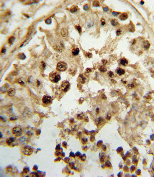 Formalin-fixed and paraffin-embedded human testis tissue reacted with HSD17B3 Antibody (Center), which was peroxidase-conjugated to the secondary antibody, followed by DAB staining. This data demonstrates the use of this antibody for immunohistochemistry; clinical relevance has not been evaluated.