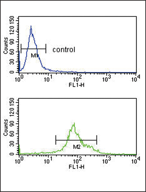 HSD17B3 Antibody (Center) (Cat. APR07808G) flow cytometry analysis of K562 cells (bottom histogram) compared to a negative control cell (top histogram).FITC-conjugated goat-anti-rabbit secondary antibodies were used for the analysis. |