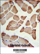 LFNG Antibody (Center)(Cat. AMM06247G) IHC analysis in formalin fixed and paraffin embedded skeletal muscle followed by peroxidase conjugation of the secondary antibody and DAB staining. This data demonstrates the use of the LFNG Antibody (Center) for immunohistochemistry. Clinical relevance has not been evaluated.