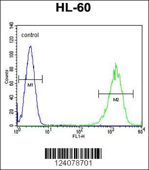 LFNG Antibody (Center) (Cat. AMM06247G) flow cytometric analysis of HL-60 cells (right histogram) compared to a negative control cell (left histogram).FITC-conjugated goat-anti-rabbit secondary antibodies were used for the analysis. |