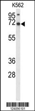 Western blot analysis of LRRC4 Antibody (C-term) (Cat. APR11273G) in K562 cell line lysates (35ug/lane). LRRC4 (arrow) was detected using the purified Pab.