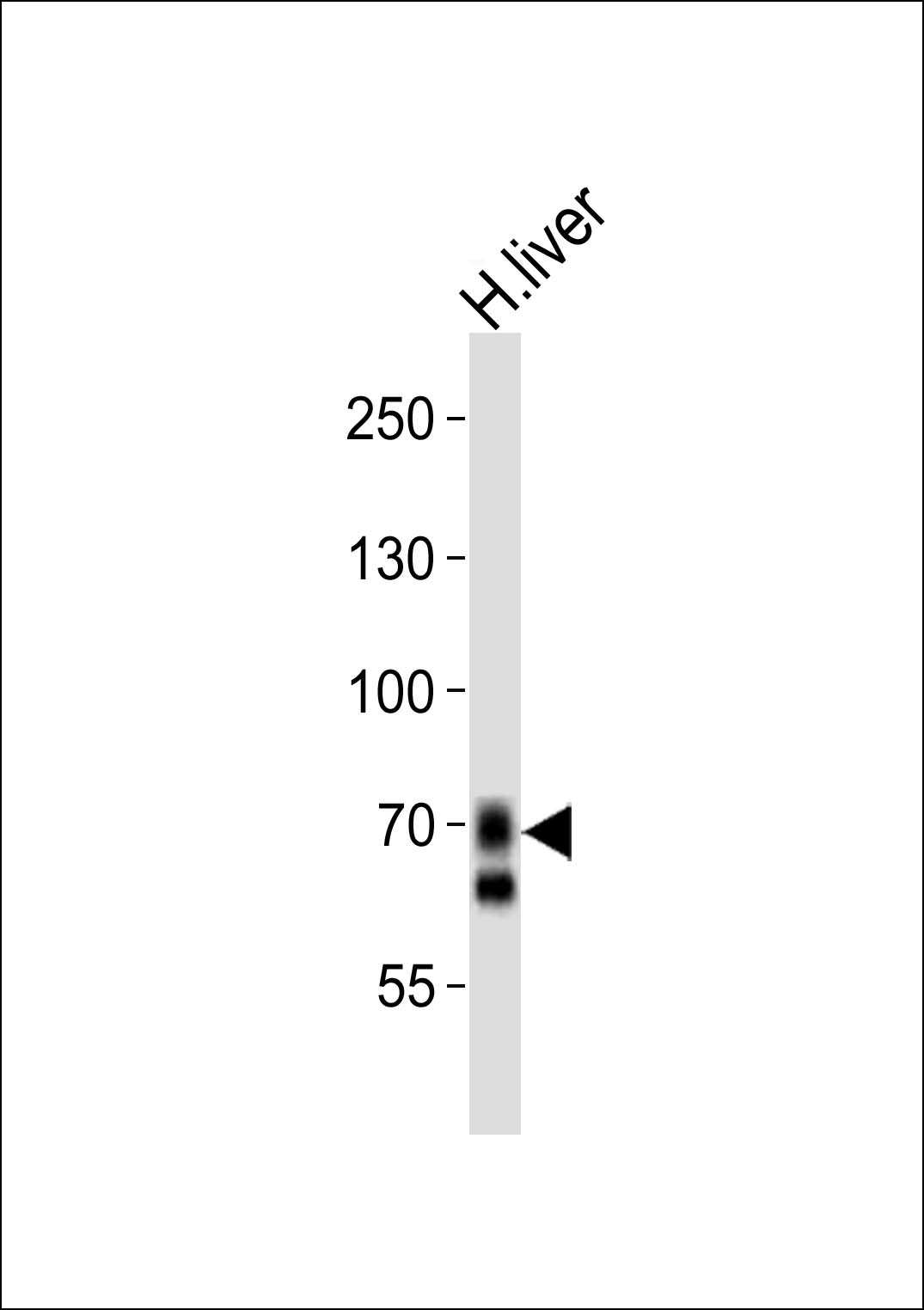 Western blot analysis of lysate from human liver tissue lysate, using SLCO1B1 Antibody (Center)( APR10154G). APR10154G was diluted at 1:1000. A goat anti-rabbit IgG H&L(HRP) at 1:10000 dilution was used as the secondary antibody. Lysate at 20ug.