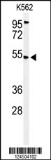 Western blot analysis of CBAA1 Antibody (N-term) (Cat. APG02452G) in K562 cell line lysates (35ug/lane). CBAA1 (arrow) was detected using the purified Pab. |